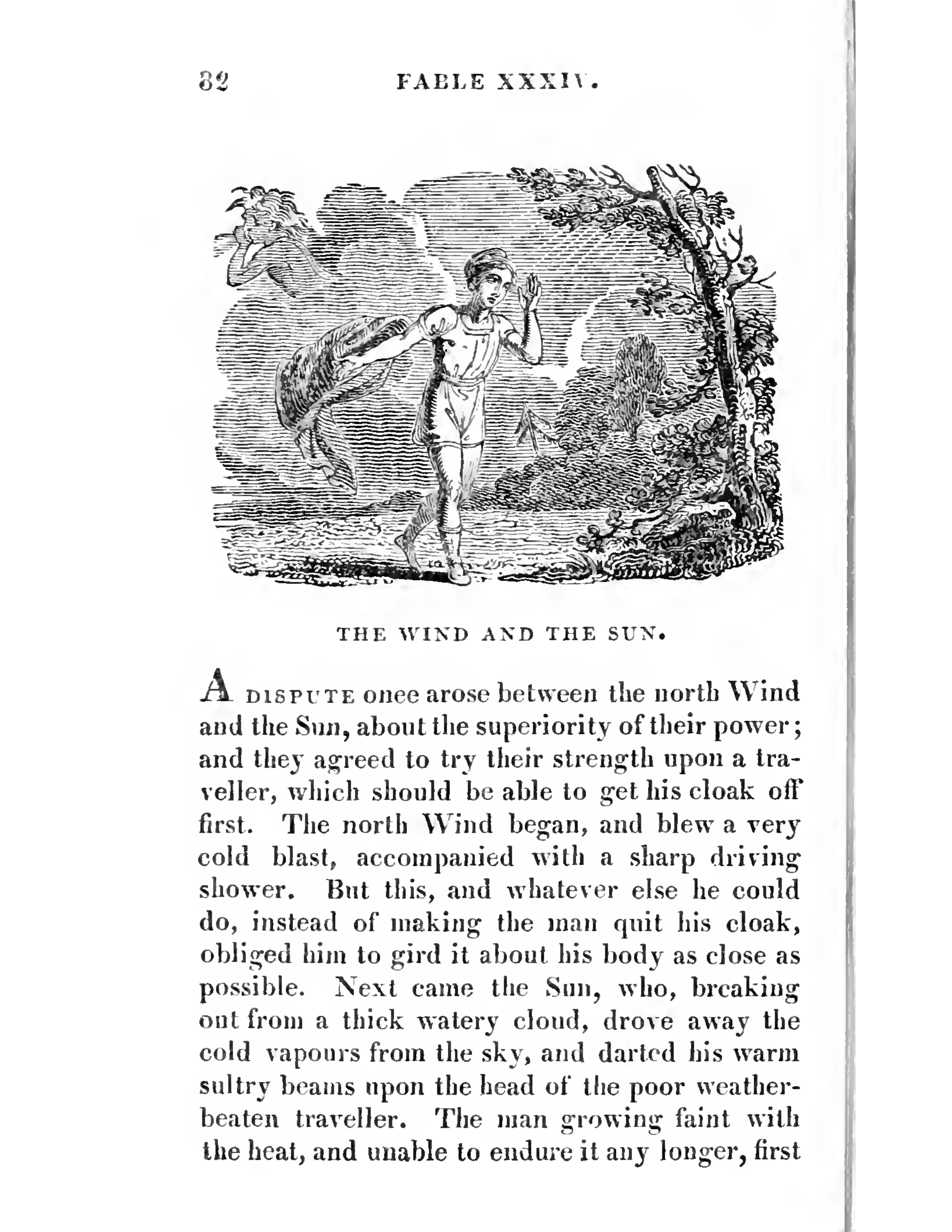 A woman is in the centre of the image, walking with her right leg forward. Her left hand is up, blocking the sun from her face, while her right arm trails behind her while she holds a piece of fabric. Light rays shine through the top right of the image. There is the upper torso and head of a person in the upper left in the clouds blowing wind. A tree is in the foreground on the right of the image.