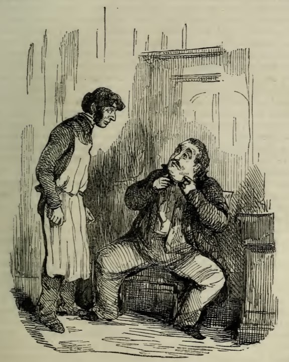 Joseph Sedley, seated in a chair in his bed-chamber, gestures at his face to tell Isidor to shave off his moustaches as his French is not good enough to be understood. Jos is afraid of being mistaken for a military man and killed by the victorious French army.