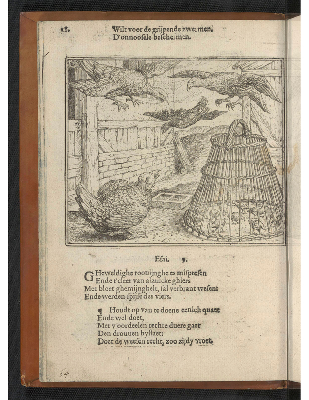 Two large birds attack a smaller bird in the air. The small bird dives as the other two reach for it with their talons. A third bird watches from the ground of a barn. Ten chicks on the right of the page are confined in a woven cage, safe from the altercation.