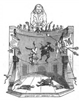 In this image we see the Lilliputians performing for Gulliver. Three are walking on a tightrope, with one doing a handstand, another juggling, and the third walking with a long pole. A fourth man is lying on the ground, as though he fell off the tightrope. A crowd watches the performance from above, with Gulliver sitting in the back. This performance was used for participants to earn their place in high favour at the royal court. Pillows are on the floor to help break the fall of anyone who might slip. This image comes when Gulliver is being accepted into Lilliputian society. The same image appears in the 1839 Krabbe edition.