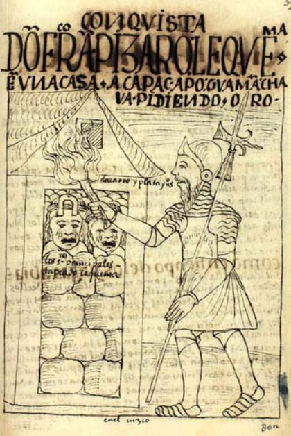 This chapter focuses on discussing the arrival of Spaniards and the Spanish conquest of Peru. This image depicts Don Francisco Pizarro, one of the leading conquistadors in the conquest of Peru, on the right side of the image suited in his armour. He is illustrated holding a torch and placing it on a house. He is setting a house on fire that contains Capac Apo Guaman Chaua, a noble lord second in command to the emperor, as well as other noble lords. The lords inside the house have tears running down their faces as they are walled in the house and unable to escape. The conquistadors locked these lords in the house to demand gold from them. When the lords did not comply, Pizarro set the house afire and killed the lords. The caption written to the left of Pizarro’s face reads, “daca oro y plata, yndios” [give me gold and siler, Indians]. The caption written below the faces of the noble lords reads, “los senores principales tapeado le quema” [the noble lords, walled in to be burnt]. The caption at the bottom of the image identifies the location as it reads, “en el Cuzco” [in Cusco].