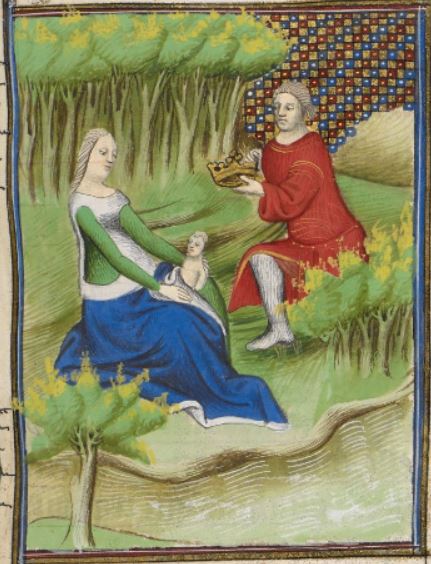 This illumination depicts Lavinia, the wife of Aeneas and queen of Laurentum, hiding in the forest. Boccaccio explains that after her husband Aeneas died, Lavinia fled to the forest as she was afraid that her stepson would kill her and her newborn son, Silvius. Lavinia was wrong, and Ascanius voluntarily gave the kingdom of Laurentum back to her and helped raise Silvius. Ascanius is depicted holding a crown, presenting it to Lavinia as he offers her kingdom back. Lavinia is depicted holding her newborn son in her arms.
