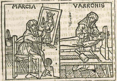 Marcia, a Roman woman who remained a virgin her entire life, is depicted on the left side of the engraving painting a portrait. Boccaccio explains that Marcia is worthy of renown for her chastity and for her painting and sculpting abilities. She is known to have mostly painted and sculpted figures of women, which is why there is a portrait of a woman wearing a crown in her painting. The right side of the engraving depicts Marcia sculpting a figure of a woman. Her sculpting tools are illustrated on the table in front of her. Marcia’s name is engraved at the top of the engraving near the left-hand corner in order to identify her. The name “Varronis” is engraved at the top on the right side of the engraving, which refers to her father, Varro.