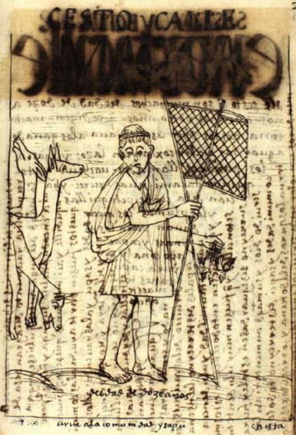 The author explains that there were ten paths for pmen to follow in the Inca Empire based on age division. This sixth group was called macta [young boy]. This group was young boys aged twelve to eighteen years old who had the duties of watching over farmer’s herds and to catch birds that would be used for meat. The young boy depicted in the image is illustrated holding a net in his right hand and three dead birds in his left. There is a herd of llamas depicted standing behind him. The caption at the bottom of the image reads “de edad de doze años cirue a la comunidad y sapci” which translates to “twelve years old, he serves the community and their sapsi [property].”