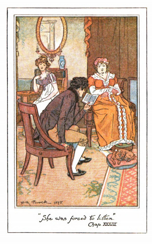 Here we see Mr. Crawford reading a passage of Shakespeare to Lady Bertram and Fanny. Fanny was reading to Lady Bertram when Mr. Crawford walked into the drawing room. She stopped reading when Mr. Crawford walked in. He tried to convince her to continue reading, but she refused. Mr. Crawford then picked up the book and continued reading the passage where Fanny left off. Fanny did not want to listen but found his reading captivating. It was at this point that Mr. Crawford had decided he wanted to make Fanny love him. This scene occurs in chapter 33 as noted underneath the title of this image. The characters are shown in the traditional regency style. Fanny and Lady Bertram wear the regency style dress with an empire waist. Fanny’s hair is worn tied up and Lady Bertram wears a mop cap. Mr. Crawford wears a waistcoat and tailcoat, and knickers that stop at the knee. The regency period dated to the early nineteenth century (1811-1820) when George, Prince of Wales, later George IV (r. 1820-1830), reigned as regent for his mentally ill father, King George III (r. 1760-1820). The regency period is associated with the rise of neoclassicism in art and fashion.