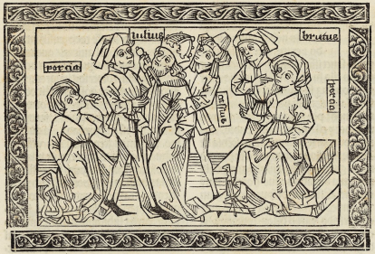 This engraving depicts three separate events. The far right of the engraving depicts a man named Brutus having a discussion with his wife Portia. We know that these figures are Brutus and Portia as Portia’s name is engraved beside her body and Brutus’ name is engraved above his head. Brutus is telling his wife the conspiracy plan to kill Julius Caesar. After hearing the conspiracy plans, Portia took a barber’s razor and cut herself with it. The engraving depicts the barber’s razor sticking out of her foot. She does this to prepare herself in case she has to kill herself should the conspiracy not work out in Brutus’ favour. The centre of the engraving depicts the assassination of Julius Caesar. Brutus is on the left side of Caesar, stabbing him in the chest. A man named Cassius is behind Caesar as he stabs his abdominal area. Their names are engraved above their heads. The far left of the engraving depicts Portia eating burning hot coals from the fire directly beside her after hearing of her husband’s death.