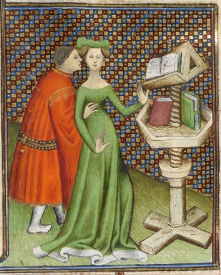 This illumination depicts a Greek woman named Leontium. Boccaccio explains that Leontium was an intellectual scholar and philosopher and became renowned for criticizing and speaking against certain philosophers of her time. Leontium is depicted standing in the centre of the image with books sitting on a podium beside her. These books are representative of her intellectual life. There is also a man holding Leontium as he stands behind her. This is depicted due to her becoming a prostitute later in her life. Boccaccio believes her fame was hindered by becoming a prostitute.