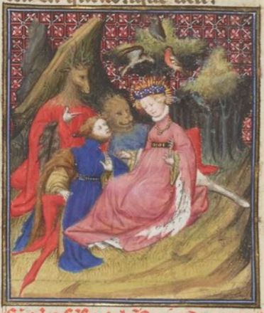Circe is sitting in the centre of the image wearing a pink dress and a crown. She was known for her magic and skills with herbs and incantations. There are figures standing beside Circe whose bodies are in the form of a human while their heads are transformed into animals. Boccaccio explains that these animals are the companions of Ulysses, and that Circe was known to transform those who landed on her shores into animals. Ulysses is the only one depicted in his human form.