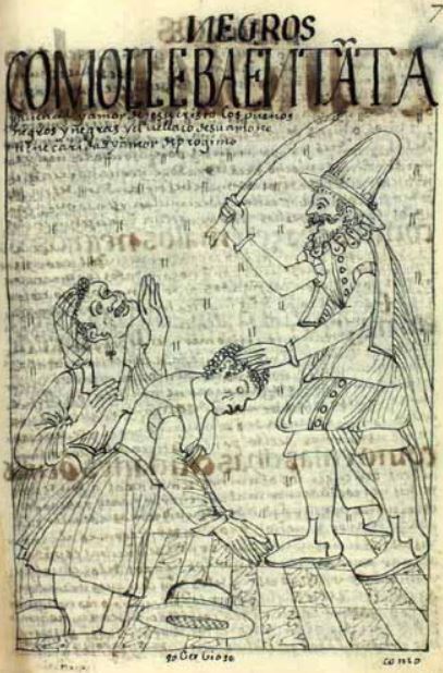 This image depicts the mistreatment of the black population in colonial Spanish society of Peru. There is a Spanish master standing on the right side of the image holding a long stick in his right hand as he beats the black slaves kneeling before him. The author explains that, despite the black people of Peru being slaves, they were good, devout Christians who had patience when being mistreated by their masters. The kneeling woman is looking at her master with tears running down her face as she holds her hand in the air. The kneeling man has his head pointed towards the ground as he also has tears running down their face.