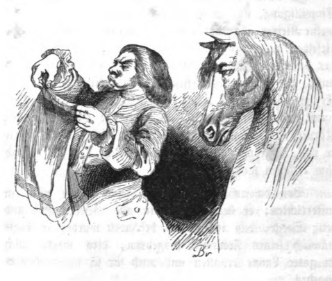 Intrigued by the European’s technology, Gulliver explained how he arrived on the island. He explained how ships work and used his handkerchief to explain the ship’s sails, seen here. In this image Gulliver uses his breath to simulate wind, using a handkerchief to simulate the sails to his master. Gulliver did this to explain how ships were built and how they worked and how he arrived in the Country of the Houyhnhnms. The same image appears in the 1843 Krabbe edition.