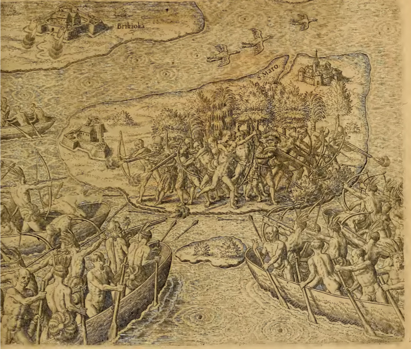 A mixed group of Indigenous people and Europeans stand on an island labelled ‘S. Maro’ and a group of Indigenous people in canoes are arranged along the shore facing the group on the island. The two groups are engaged in conflict, with the Europeans firing guns and the Indigenous people shooting arrows. At least two Indigenous people in one canoe (second from left) and one person in another (far right) have been killed or wounded. There appears to be a European captive in the prow of the canoe in the middle – the man is nude and has a rope tied around his neck, and he fires a gun at the group on the island. There are two fortifications on the island, as well as one on the mainland labelled ‘Brikioka’, from which several cannons are firing.