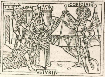 An old noble Roman woman named Veturia is depicted on the left-hand side of the engraving with her daughter-in law and grandchild beside her. We know this figure is Veturia as her name is engraved below her feet. She is illustrated pointing at the man on the right-side of the engraving. This man is her son, Coriolanus (his name is engraved above his head). Boccaccio explains that after Coriolanus had been exiled from Rome for neglecting the plebian class, he planned an attack on Rome. Veturia, with the help of her daughter-in-law (Volumnia) and grandchild, went to speak with Coriolanus at his camp and convinced him to not go through with the attack. Boccaccio explains that he decided to write on Veturia for her honour as a mother and a woman.