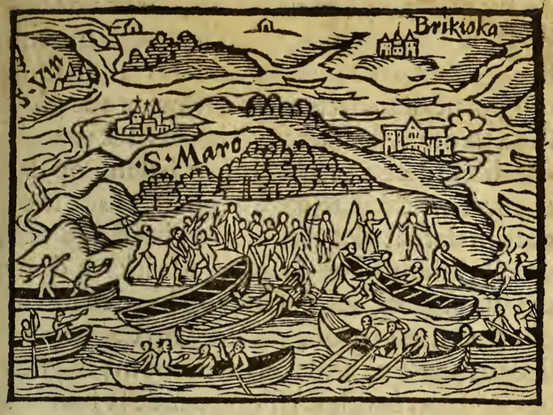 A group of Tupinambá Indigenous people capture a European man on an island called Saint Maro in Brazil. The European man stands on the shore near the left side of the image, with two Indigenous people holding on to him and brandishing weapons. Several of the Indigenous people on shore hold either a bow, a spear, or both. Some members of the group are departing the island in canoes, while others in canoes row near the shore. Several settlements can be seen in the background, including one labelled “Brikioka”.