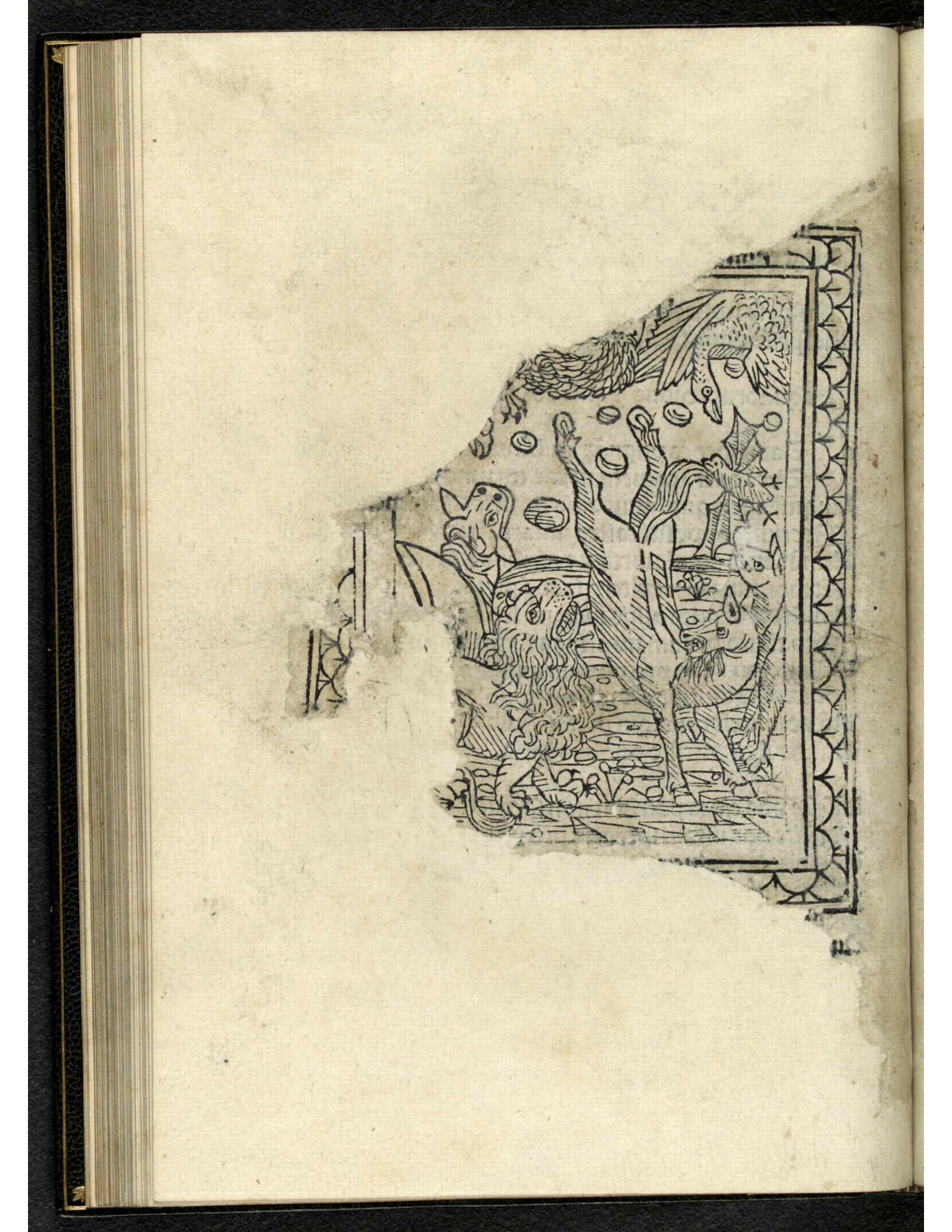 Only a fraction of the image is visible, as the rest has worn off with time. From what is visible, there is a combination of animals on the ground, all looking skywards. There is a lion, a cow, a wolf, and a horse. The horse is on its front legs, kicking back rocks towards the sky with its hind legs. All the animals on the ground have an angry expression to the sky. In the sky, there is a bat taking flight on the right side. In the upper right corner, a goose is looking down at the ground animals. The other sky animals are hard to determine, but from the claws visible at the left upper corner, it could either be an eagle or a dragon.