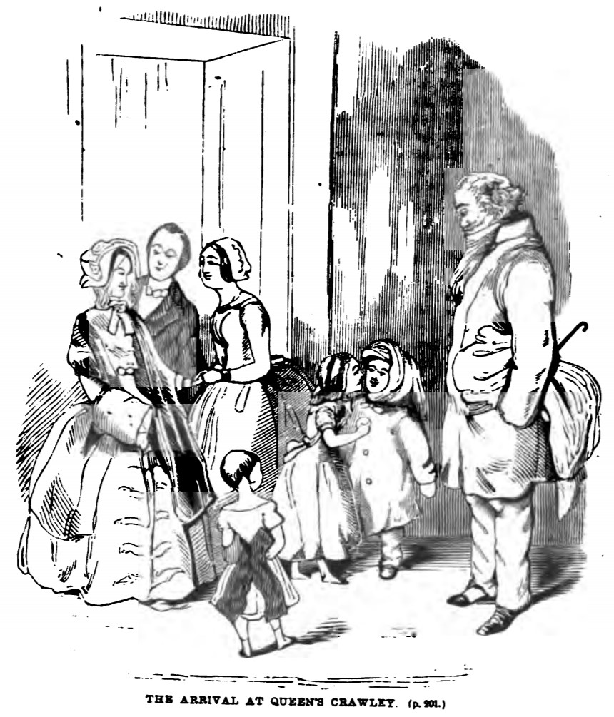 Matilda Crawley greets her cousin, the younger Rawdon Crawley, while her brother Pitt Binky hangs back and watches. To their side is Mr. Rawdon Crawley, watching his son. In the background, Sir Pitt and Lady Jane are greeting Rebecca Crawley, who has just arrived at Queen’s Crawley with her husband and son. Below the illustration is printed its title and location in the story, “THE ARRIVAL AT QUEEN’S CRAWLEY. (p. 201.)”.