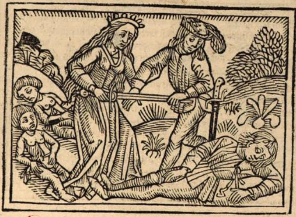 This engraving depicts Berenice, the queen of Cappadocia, stabbing a servant in his abdominal area to avenge her sons’ deaths. After her sons had died at the hand of her brother, Mithridates, Berenice sought vengeance against him. The slave that Berenice is stabbing in this engraving is Caenus, a man who was involved in the murder of her sons. Although she is depicted stabbing him with a sword in this engraving, Boccaccio explains in his story that she actually chased Caenus down in a chariot, and after hitting him in the head with a rock, she drove over his body with the chariot until he died. The dead figures in the engraving who are lying on the ground are assumed to be Berenice’s children.