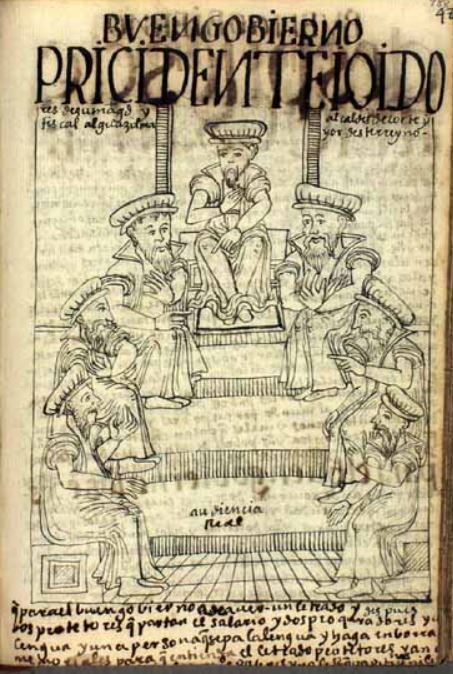 This image depicts the royal audience of Lima, the ruling body of Spanish colonial Peru. There are three men sitting on each side of a staircase with one man sitting at the top. They are all dressed in traditional European/Spanish clothing. The author explains that the governors rarely favour or care for the indigenous peoples of Peru. The large caption written at the bottom of the image reads, “que para el buen govierno a de auer un letrado y dos protetores que partan el salario y dos proquradores y u[n] lengua y u[na] persona que sepa la lengua y haga en borra[dor] memoriales para que entienda el letrado protetores y an[...] y no le [...] pitici[o]nas ni le [...]” [for good government there should be a learned advocate, two defenders who shall share a salary, two attorneys, an interpreter, and another person fluent in the [Quechua] language who can draw up memoranda for the use of the advocate, the defenders, and […] petitions, nor […]].