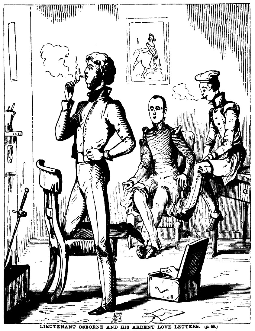 George Osborne stands facing the fireplace with one leg resting on a wooden chair, smoking a cigar which he has lit using a love letter from Amelia Sedley. At the base of the chair is an open chest, filled with more of her letters. Two other officers are seated in the background. One is sitting on the edge of the desk, also smoking. The other is Dobbin, seated in an armchair over which a portrait of a woman hangs, looking shocked. Below the illustration is printed its title and location in the story, “LIEUTENANT OSBORNE AND HIS ARDENT LOVE LETTERS. (p. 60.)”.