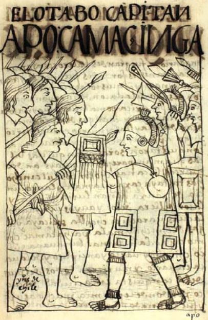 This illustration depicts the eighth captain, Apo Camac Inca. These captains were a level of Inca authority who helped lead the conquest of the Andes. This captain was the son of Pachacuti Inca Yupanqui, the king of the Inca Empire. This captain is depicted leading an army on the right side of the image as they face their enemies. The author explains that Apo Camac Inca lead 50,000 soldiers to conquer Chile. The words “yndios de chile” is written below the soldiers on the left-hand side of the image to identify them as the “Indians of Chile.” The author explains that the captain and his soldiers killed over 150,000 Chileans and starved them out for ten years in order to conquer the entire country.