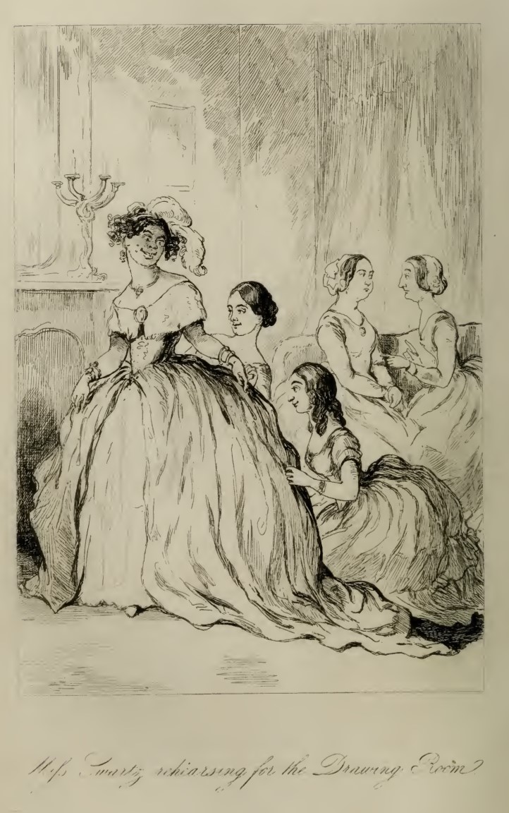 Miss Rhoda Swartz stands in front of Jane and Maria Osborne, dressed in a large gown with many pieces of jewelry and feathers in her hair. In the background, Miss Swartz’s chaperone and Miss Wirt are seated on a sofa, talking to each other. Below the illustration is printed in cursive its title, “Miss Swartz rehearsing for the Drawing-Room.