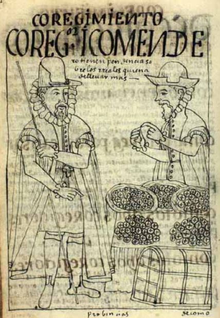This image is illustrated in a chapter that discusses and criticizes the government and society in Spanish conquered Peru. The two men depicted in the image are a Corregidor [Magistrate] and an Encomendero [Trustee] who appear to be arguing over a large sum of money on the table in front of them. They are dressed in traditional European clothing. The author criticizes these government officials by saying they lack respect for the indigenous peoples of Peru and exploit their labour.