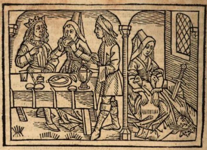 This engraving depicts two separate scenes. The left side of the engraving depicts Queen Cleopatra of Egypt sitting at a dinner table with her husband Antony beside her. Cleopatra had very expensive tastes and demanded a feast which would cost an outrageous amount of money. When Antony did not provide the entire feast Cleopatra demanded, she took out one of her pearl earrings and dissolved it in her drink and drank it to get the luxuriousness she desired. Cleopatra is depicted drinking the pearl in this image. There is a third figure in this scene, which is a man named Lucius Plautus who was called to be a judge of the feast. The right side of the engraving depicts the suicide of Antony. After realizing the forces of Octavian were on their way to destroy them, Antony plunged his sword into his chest, as depicted in the engraving. Cleopatra is depicted kneeling over his body before she kills herself as well.