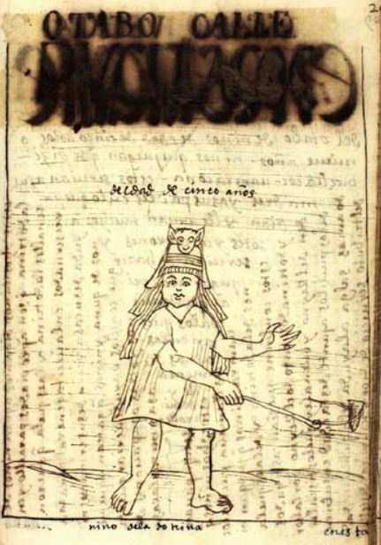 The author explains that there were ten paths for men to follow in the Inca Empire based on age division. This eighth group is called pucllacoc [playful]. This group refers to children aged five to nine years old and their duties include helping their mothers and fathers as best as possible with younger siblings. The child in the image is depicted playing with a sling and a stone and wearing a head garb that appears to have a bat skin on it. The caption at the bottom of the image reads “de edad de cinco años niño de la dotrina” which translates to “five years old, child of school age.”