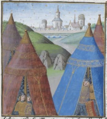 This image appears in the chapter that treats Queen Joanna of Sicily and Jerusalem. Boccaccio praises Joanna on her fierce ability to rule which was not common for women to do during her time. He explains that Joanna would attack cities until men would flee in fear of her and her forces and she would then siege the cities. This image depicts one of Joanna’s military camps which is outside of the city that is depicted in the background.