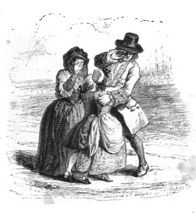 Here we see Gulliver saying goodbye to his family as he leaves for another voyage only two months after returning from Lilliput and Blefuscu. Everyone here is crying. Gulliver’s wife is on his left while his daughter and son hug him. In the background we see the docks and the ship that Gulliver was leaving on. The same image appears in the 1843 Krabbe edition.