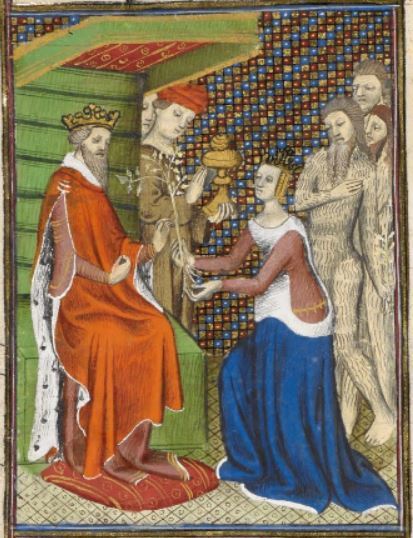 This illumination depicts Nicaula, the queen of Ethiopia, on the right side of the image meeting King Solomon of Jerusalem. King Solomon is illustrated wearing a red robe and a crown. Nicaula, as Boccaccio explains, was incredibly wise and wanted to hear and listen to the wisdom and intellect of Solomon. She had traveled from Ethiopia to Jerusalem to meet him. Nicaula is depicted kneeling and presenting King Solomon with a balsam tree. She has servants behind her carrying more gifts that she brought for the king.