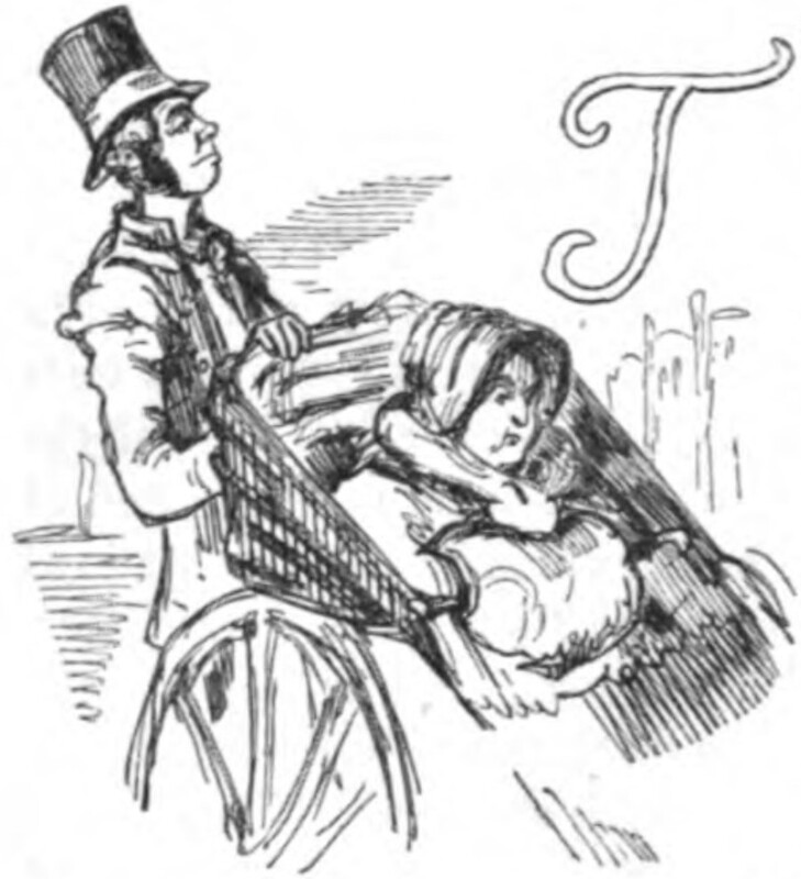 Miss Matilda Crawley sits in her wheelchair, bundled up in a bonnet and muff. The chair is being pushed by a thin man in a coat and tall hat. In the top right of the image is the letter T from “The”.