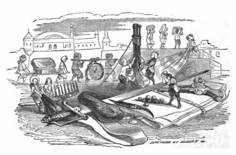 Here we see the Lilliputians taking an inventory of Gulliver’s belongings. In the foreground we see Gulliver’s sword and pistol. A Lilliputian is standing on a stack of paper counting bullets in the foreground. Two Lilliputians examine Gulliver’s comb, while others look at his telescope. In the background we see Lilliputians using sticks to carry Gulliver’s small box and pocket watch. In the distance we see other Lilliputians carry some other things on their heads and shoulders. The city skyline is visible in the background. The same image appears in the 1839 Krabbe edition.
