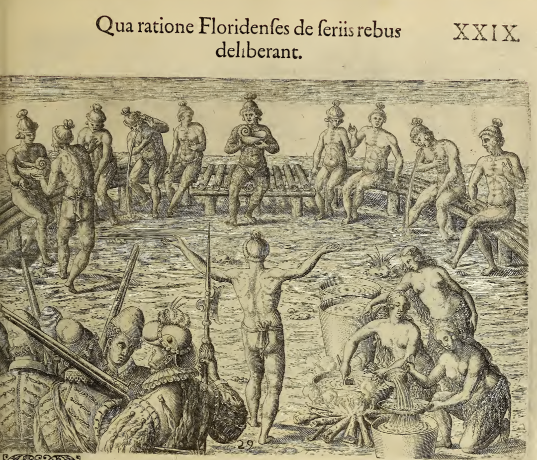 A group of Indigenous people is shown. Several men sit on wooden benches that are arranged in a semi-circle. Two men hold large shells, and two appear to be vomiting onto the ground. Three women tend to large pots on the right. To the left of the women, and individual stands with their arms outstretched. In the foreground, a group of colonists stand holding rifles.