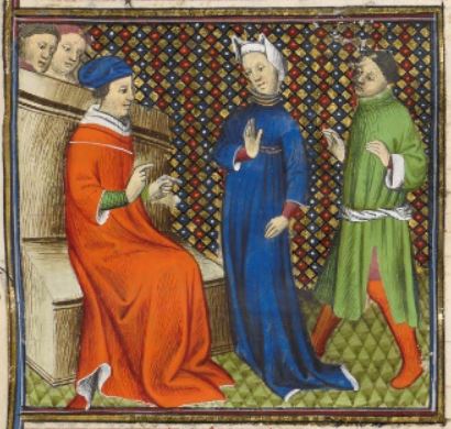 This illumination depicts a woman named Sempronia in the centre of the image wearing a blue dress. Sempronia was the daughter of the famous Tiberius Gracchus. Boccaccio explains that after her brothers were murdered, Sempronia was brought to trial by a tribune of plebeians. This image depicts that trial. The person on the left side of the image told her to let herself be kissed by a man named Equitius (who is standing behind Sempronia) and accept him as a member of the Sempronian family, however, Sempronia rejects this to protect her family’s honour and nobility.