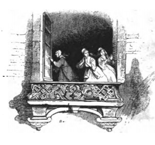 [The Lilliputian Empress and her maids looking out the window after the fire]
