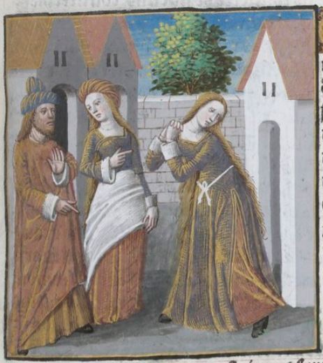 This illumination depicts Turia, a Roman woman and wife of Quintus Lucretius, on the right side of the image with her hands together as she expresses a look of despair. After her husband had gotten proscribed, Turia kept her husband safe within their house so that he would not have to go to war. She took care of him and even went so far as to go out in public and pretended to have lost her husband, so that no one would suspect that he was home. This image depicts Turia out in public pretending to be upset while looking for her 'lost' husband. There are other citizens in the image pointing at Turia and appear to be talking about her to one another. Boccaccio explains that he wrote on Turia to highlight her devotion to her husband.