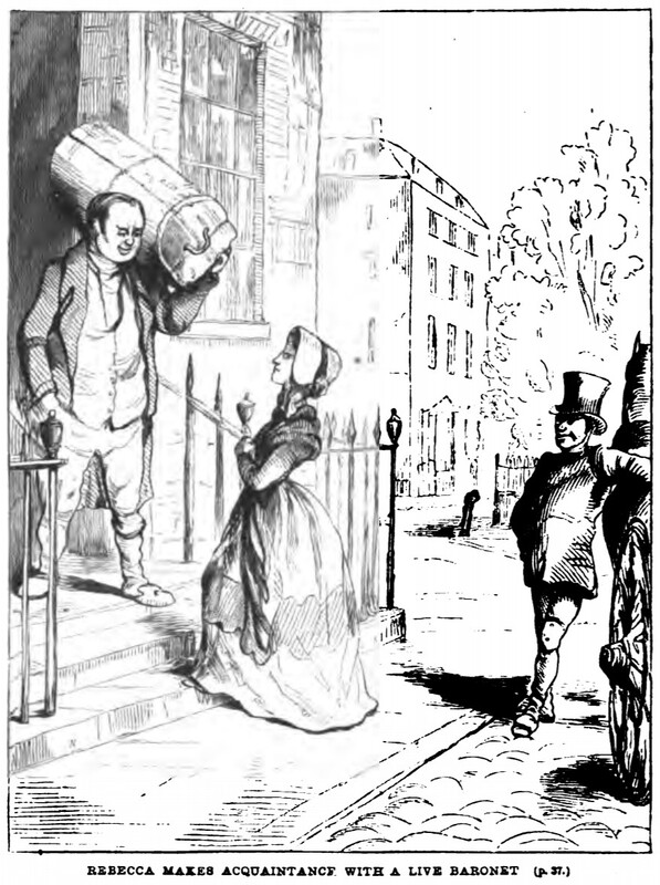 Rebecca Sharp stands in the center of the picture at the base of the staircase to Crawley mansion, scowling up at the man on the stairs. He is holding her trunk on her shoulder with his other hand in his pocket, and, though assumed by the others to be a porter, is Sir Pitt Crawley. To the right of the image, John, the Sedley’s groom, is leaning against his carriage with a smirk on his face. In the background the corner of the Crawley mansion and a neighboring house are lightly sketched. Below the illustration is printed its title and location in the story, “REBECCA MAKES ACQUAINTANCE WITH A LIVE BARONET (p. 37.)”.