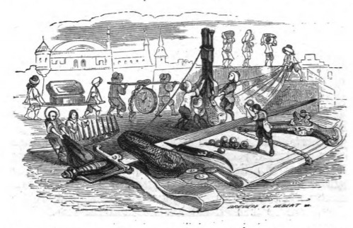 Here we see the Lilliputians taking an inventory of Gulliver’s belongings. In the foreground we see Gulliver’s sword and pistol. A Lilliputian is standing on a stack of paper counting bullets in the foreground. Two Lilliputians examine Gulliver’s comb, while others look at his telescope. In the background we see Lilliputians using sticks to carry Gulliver’s small box and pocket watch. In the distance we see other Lilliputians carry some other things on their heads and shoulders. The same image appears in both the 1839 and 1843 Krabbe editions.