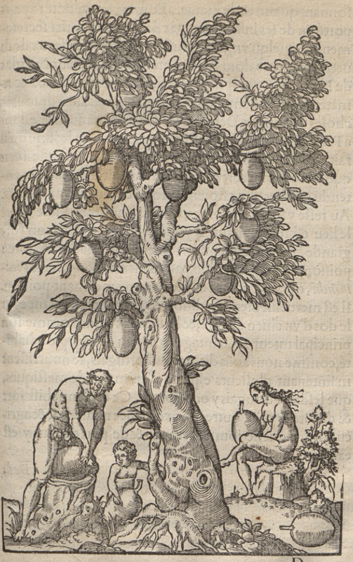 Three Indigenous Brazilians, a man, woman, and child, are shown under a tall tree with large fruit. The woman sits on a tree stump holding one of the fruits from the tree while the child stands nearby, also holding a large fruit. The man has placed one of the fruits on a nearby stump and stands bent over it. This image is identical to one found in Frankfurt, 1557.