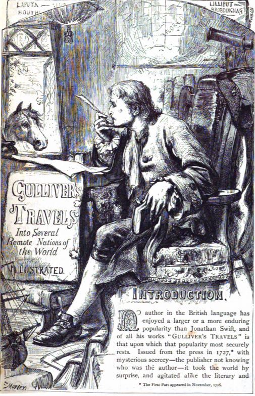 This image is presented on the first page of the introduction before the first chapter of the book. The author, Jonathan Swift, is depicted sitting in what appears to be his study as he holds a quill to his mouth and looks out the window as he holds a book in his left hand. There is a horse standing in the window looking into the study. The title of the book “Gulliver’s Travels Into Several Remote Nations of the World” is written on the left side of the engraving.