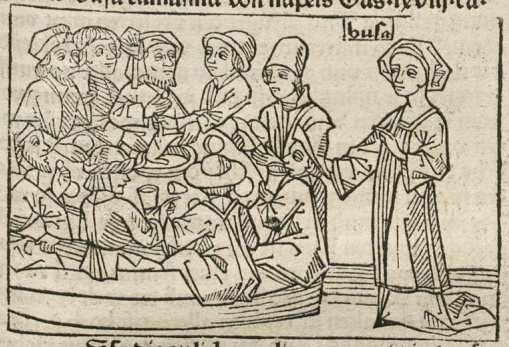 This engraving depicts a woman named Busa on the right side of the image looking at the group of people in front of her. We know that this figure is Busa as the creator engraved her name above her head. Boccaccio explains that after a city called Cannae was attacked by Hannibal the Carthaginian, the people fled to Canusium. Busa opened her home graciously to the people who fled the danger of war and provided them with hospitality and food. These are the people who are depicted sitting around Busa’s table.