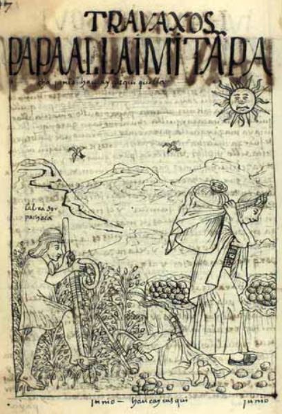 This image is reflected in the final chapter of Ayala’s chronicle where he provides a description of labours and festivals that occur in the rural areas of the Spanish colonial Andes during each month of the Inca calendar year. This image depicts the month of June, which was a time of rest after harvesting all the corn. While June was a month of rest, they also spent time harvesting potatoes. The sun is shining in the top right corner of the image while an indigenous man and two indigenous women are depicted harvesting the potatoes. The man on the left side of the image is standing with one foot pressing down onto his shovel to dig out the potatoes. The woman next to him is kneeling and using a digging device with her hands to also dig out the potatoes. The woman on the right side of the image is walking away carrying a large sack of harvested potatoes on her back. There are other full bags of potatoes beside her. The mountainous Andean landscape is illustrated in the background of the image with birds flying over top. There are words written above the native man which reads “labrador, pachaca” [labourer]. The caption at the bottom of the image reads, “junio, haucay cusqui” [June, seventh month].