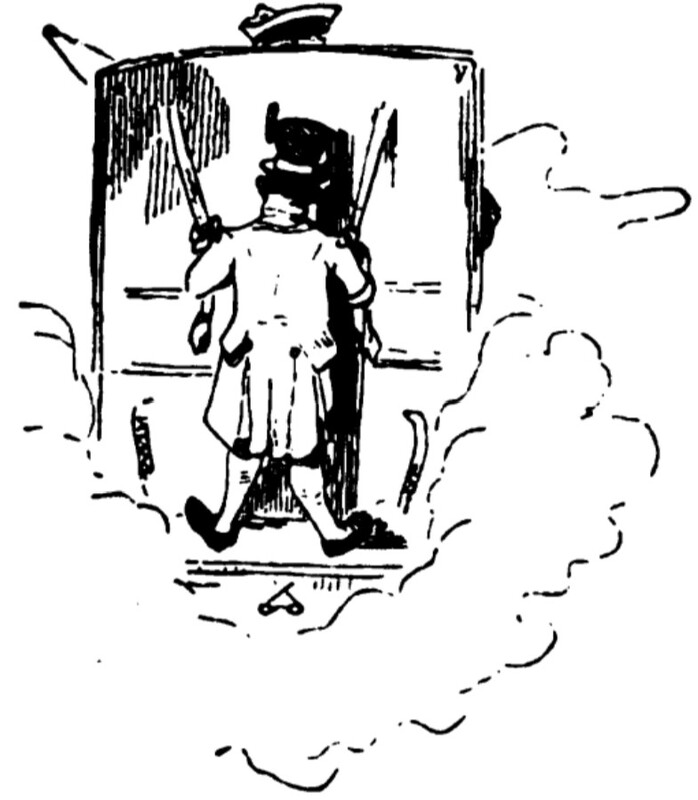 The image depicts the backside of a carriage, over the top of which the coachman’s hat can be seen. Sambo is standing on the base of the back of the carriage, holding on to two straps, as it drives away from Miss Pinkerton’s academy in a cloud of dust.