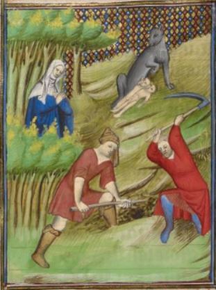 This illumination depicts Rhea Ilia (also known as Rhea Silvia) on the left side of the image dressed in a blue dress. There are two men in the foreground of the illustration digging a grave for Rhea Ilia. As a vestal virgin, Rhea Ilia was forbidden from having relationships with men. She gave birth to twin boys, and as her punishment for having sexual relations with someone, she was buried alive. Therefore, the two men are digging a grave. The twin boys were named Remus and Romulus, and they were the eventual founders of Rome. They were raised by a mother wolf after being exposed in the wilderness. There is a wolf in the background of the image with the twin boys drinking her milk.