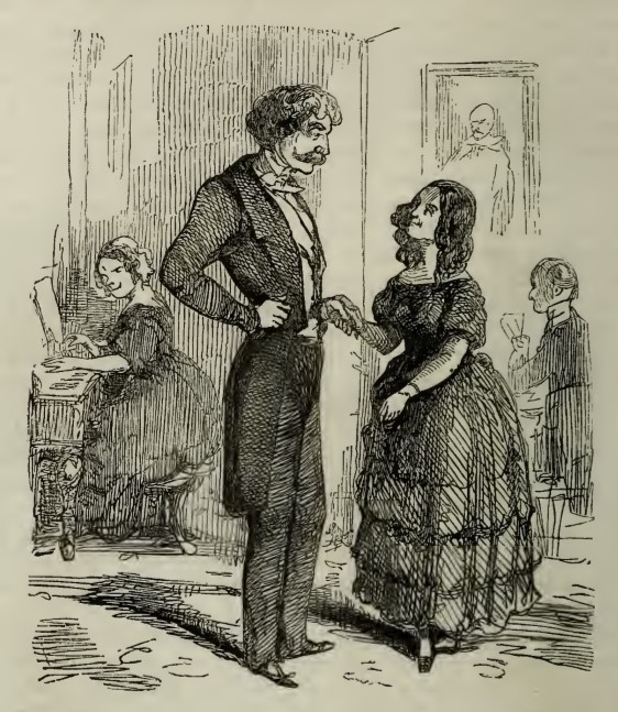 Captain Rawdon Crawley and Rebecca Sharp are in the center of the image, hand-in-hand as they perform a country dance. Mrs. Martha Crawley, Reverend Bute Crawley’s wife, is playing the piano in the background. Through the opening to the next room, a man seated at the table playing cards and a portrait hanging on the wall can be seen.