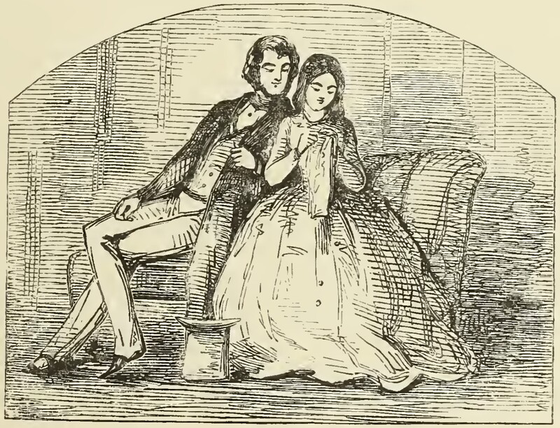 George Osborne and Amelia Sedley sit together on a chaise lounge, talking. Amelia is working on a bit of sewing, while George is leaning against her with his hat placed upside-down on the floor.