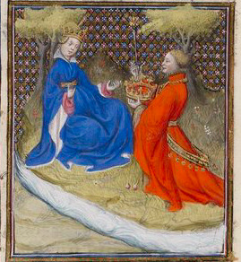 - Lavinia, wearing a blue gown and a crown, receives a gift from her husband, Aeneas, who is wearing a red robe. The gift symbolizes his kingdom – Aeneas offered his kingdom before his death.