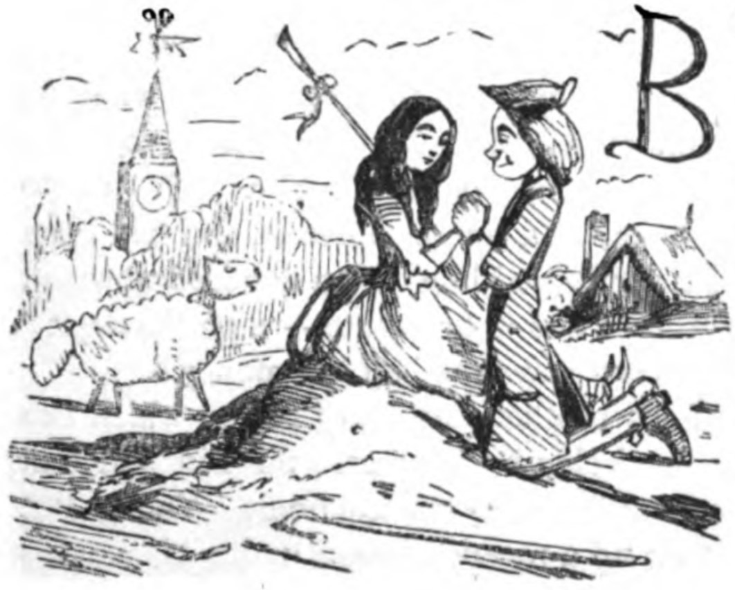 A scene depicting the simple and happy country life. A shepherdess is depicted sitting on a small hummock, a ribboned staff leaned against her shoulder. A man in uniform kneels before her, clasping her hand in his. Both are looking contentedly at the other. Her crook lies on the ground beside the hummock, and behind it is one of her sheep. In the background are a farmhouse and clocktower, and the top right of the image is the letter B from “Besides”.