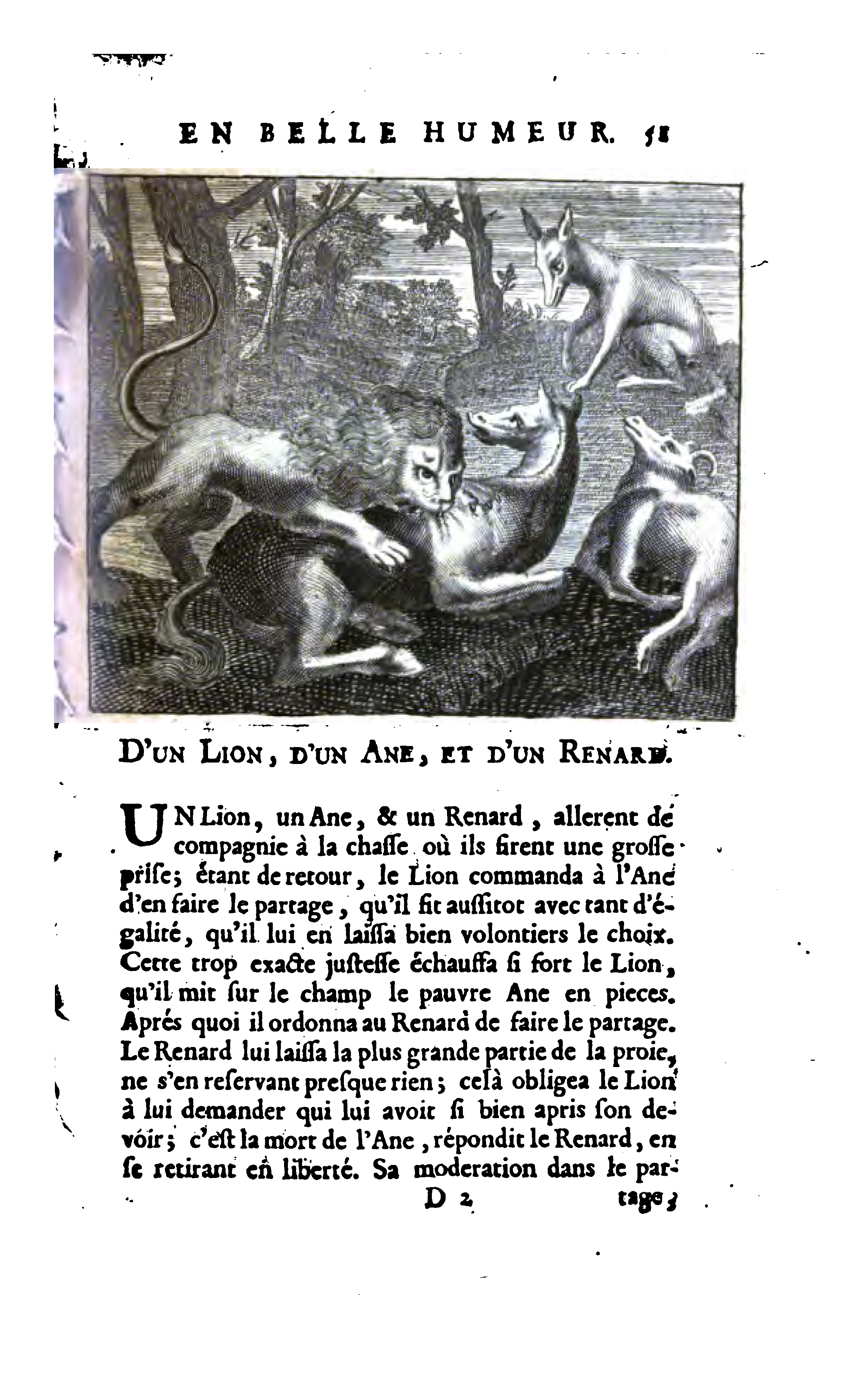 There is a lion in front of the image tearing through the flesh of a donkey. The donkey expresses sadness and terror. There is another donkey next to this scene, possibily already dead but he seems to be just laying down with his eyes open. Behind them there is a fox looking down on his paw. There are trees behind them and houses.