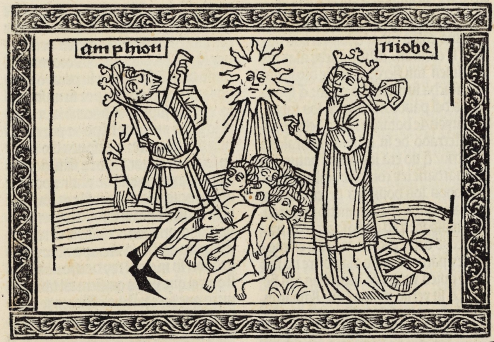This engraving depicts Niobe, the daughter of King Tantalus of Phrygia, on the right-hand side of the engraving wearing a crown. We know that this is Niobe as the creator engraved her name beside her head to identify her. Niobe had become proud of the fact that she had more children than Latona, mother to Diana and Apollo. As punishment for her hubris against the goddess, all of Niobe’s children, as told by Boccaccio, had been killed by the plague. Her children are illustrated in the centre of the engraving, being killed by the rays of the sun which signify the plague. Grieved by the loss of all their children, Niobe’s husband, King Amphion of Thebes, killed himself with a knife. Amphion is depicted on the left side of the engraving as he pierces his body with the knife. His name is engraved just above his head.